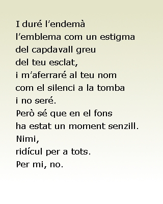 Al final dels anys m'he decidit. I m'he decidit per tots dos alhora, predominant, però el pinzell. La ploma, els poemes, cal que acompanyin al quadre, no sempre, només en aquelles obres que s'ho mereixin, i sense buscar l'avorriment de l'oient. El poema ha de donar les darreres pinzellades a l'aquarel·la. Aquelles que el pintor es va descuidar de donar.